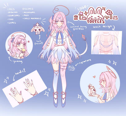 Hi! I'm Tootles, a self-taught digital artist based in Australia.Little bit about me is on my days off I love to eat lots of yummy food and go to cafes with friends. As well as gaming and talking with my friends over call at home!I draw lots of vtuber/anime/game illustrations and merch! Currently releasing regularly on Etsy and uploading my illustration processes on Gumroad.One of my goals is to one day have an artbook of my own :)Happy scrolling ε(*´・ω・)з